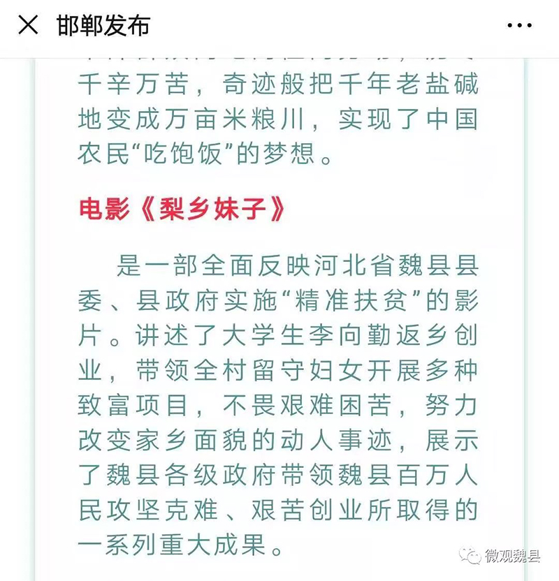 是一部全面反映河北省魏縣縣委、縣政府實施“精準(zhǔn)扶貧”的影片。講述了大學(xué)生李向勤返鄉(xiāng)創(chuàng)業(yè),帶領(lǐng)全村留守婦女開展多種致富項目,不畏艱難困苦,努力改變家鄉(xiāng)面貌的動人事跡,展示了魏縣各級政府帶領(lǐng)魏縣百萬人民攻堅克難、艱苦創(chuàng)業(yè)所取得的一系列重大成果。